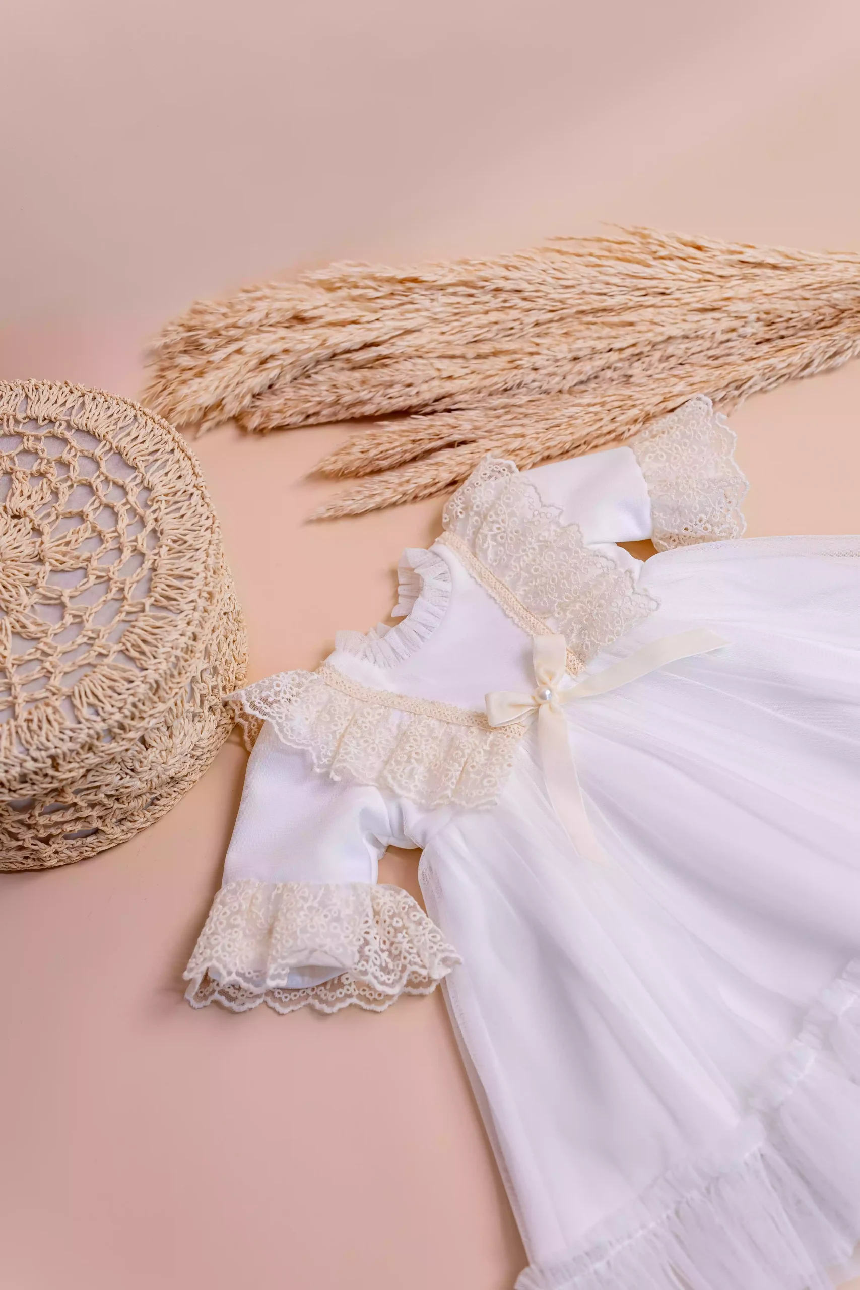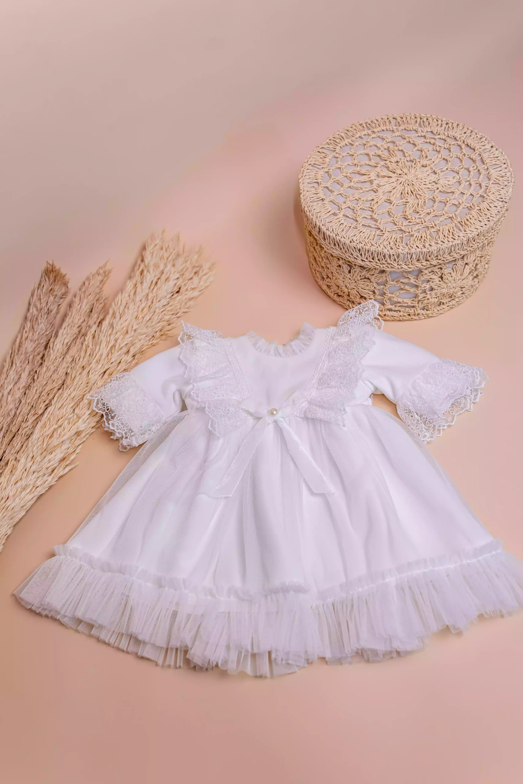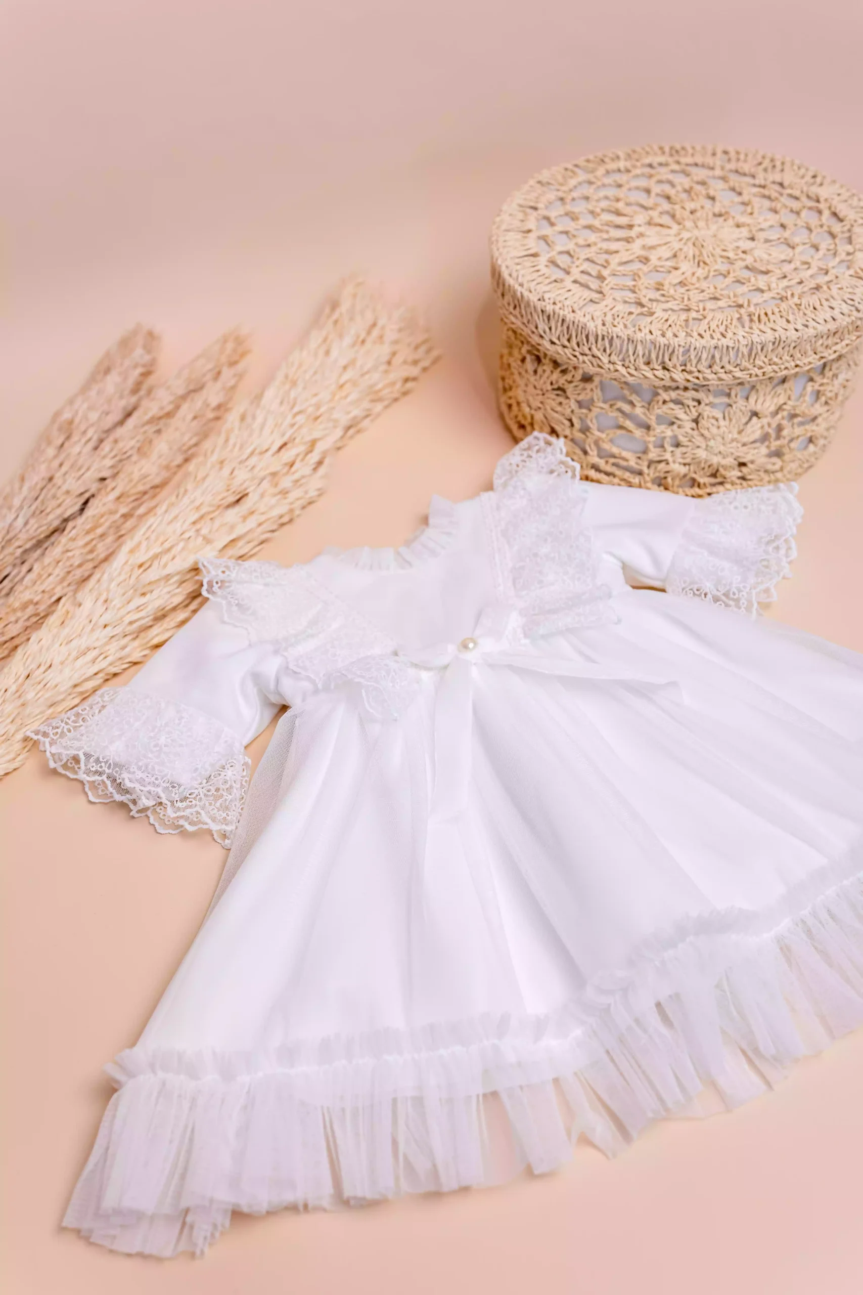 Rochița de botez Rania – eleganță desăvârșită din dantelă și tulle, cu fundă din perle și fustă amplă, ideală pentru prima zi specială a micuței tale.
