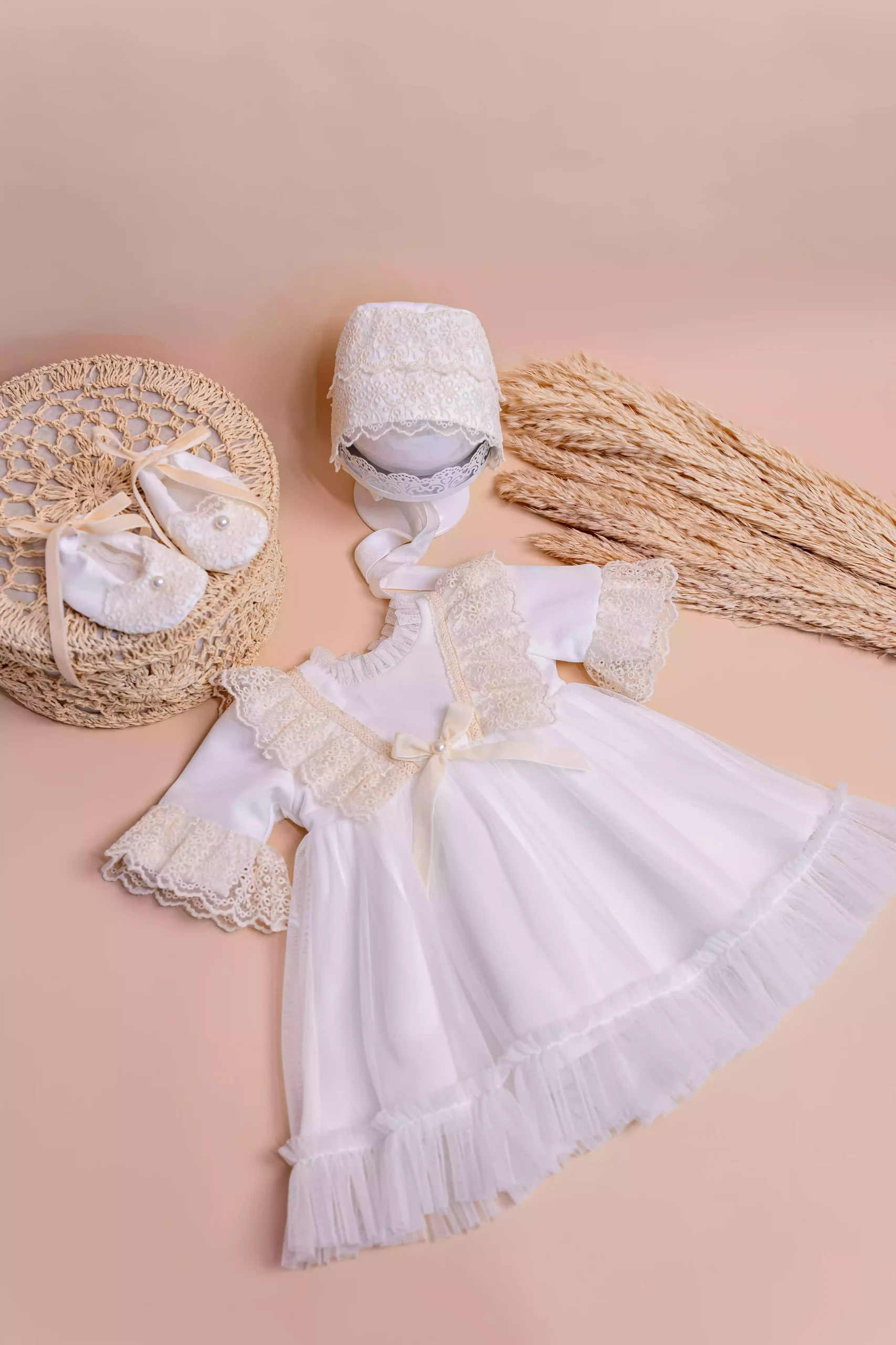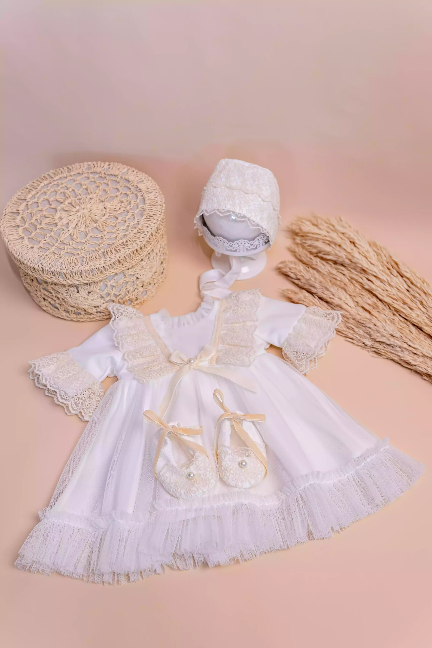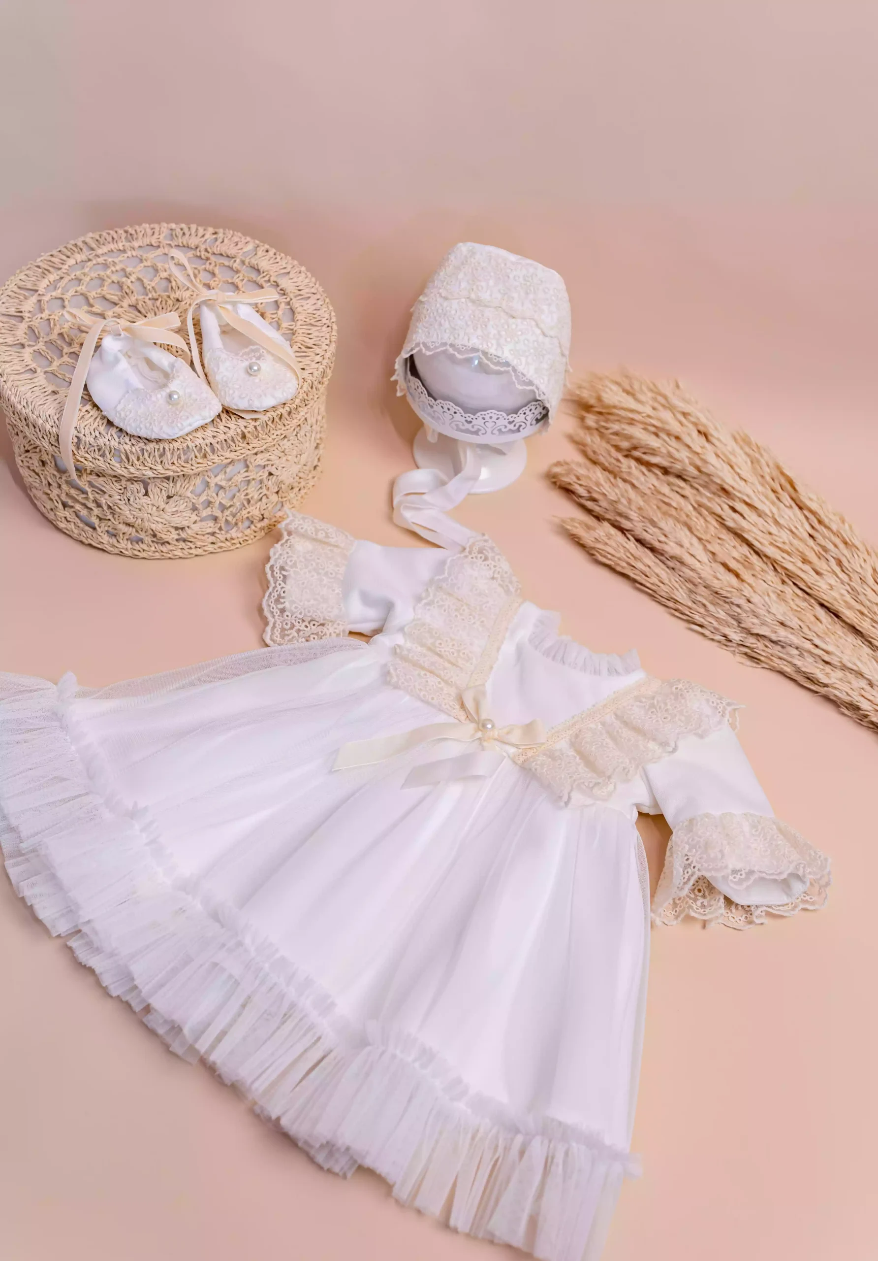 Rochița de botez Ivanna îmbină rafinamentul designului modern cu farmecul motivelor tradiționale, oferind confort deplin datorită interiorului din bumbac 100%. Setul complet include rochiță, botoșei asortați și bentiță delicată, perfecte pentru un botez memorabil.