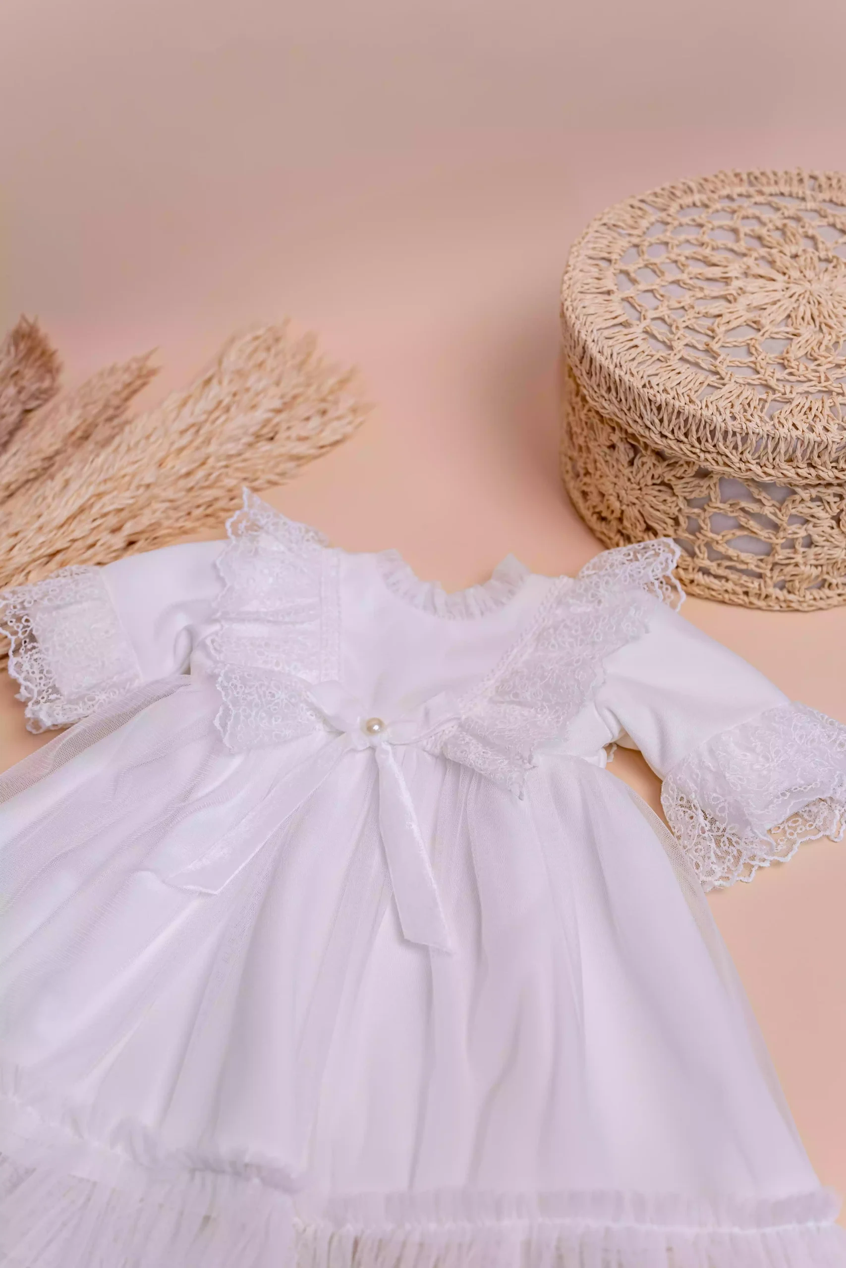 Rochița de botez Tina este alegerea ideală pentru un eveniment memorabil, combinând dantela Chantilly fină cu tul vaporos, detalii delicate din perle și o croială confortabilă, căptușită cu bumbac moale.