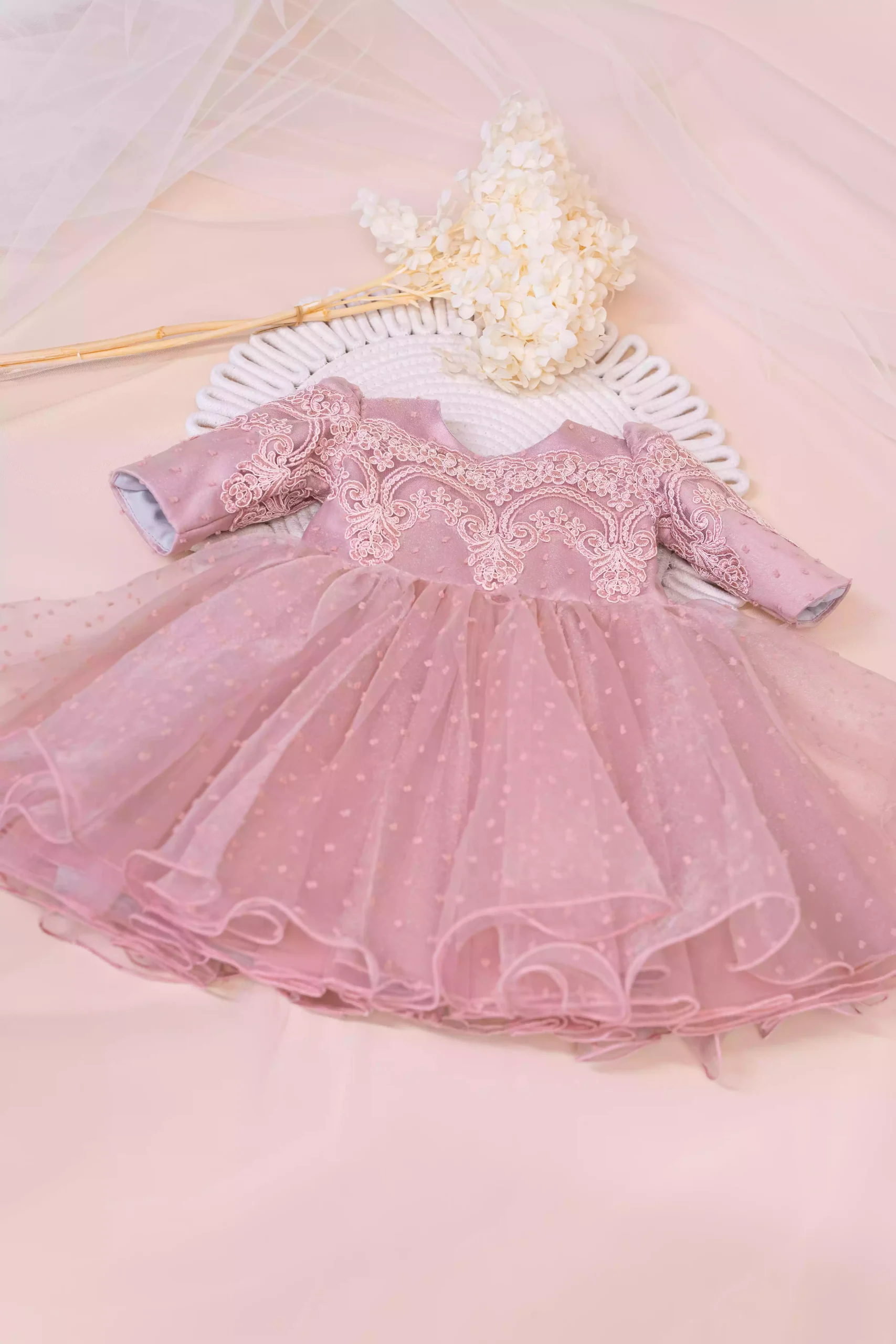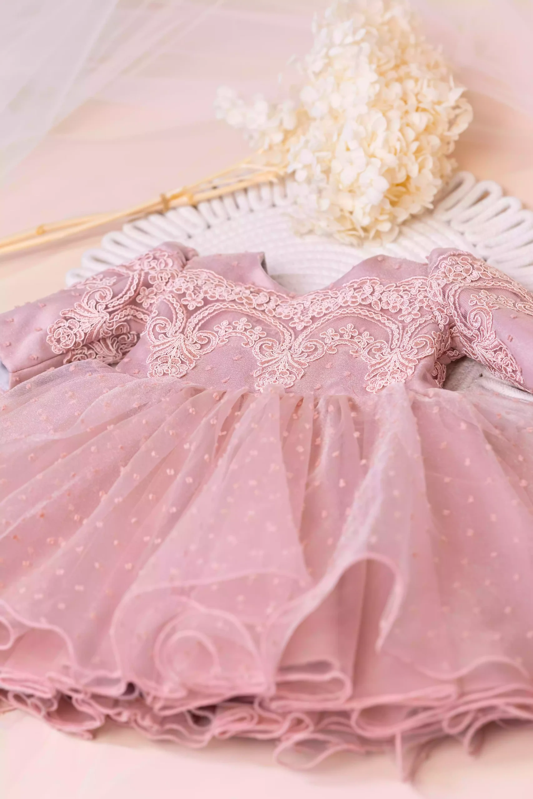 Descoperă rochița botez Chloe, o rochiță elegantă din tul și dantelă, cu volane, mâneci florale și căptușeală din bumbac – perfectă pentru ziua specială a fetiței tale.