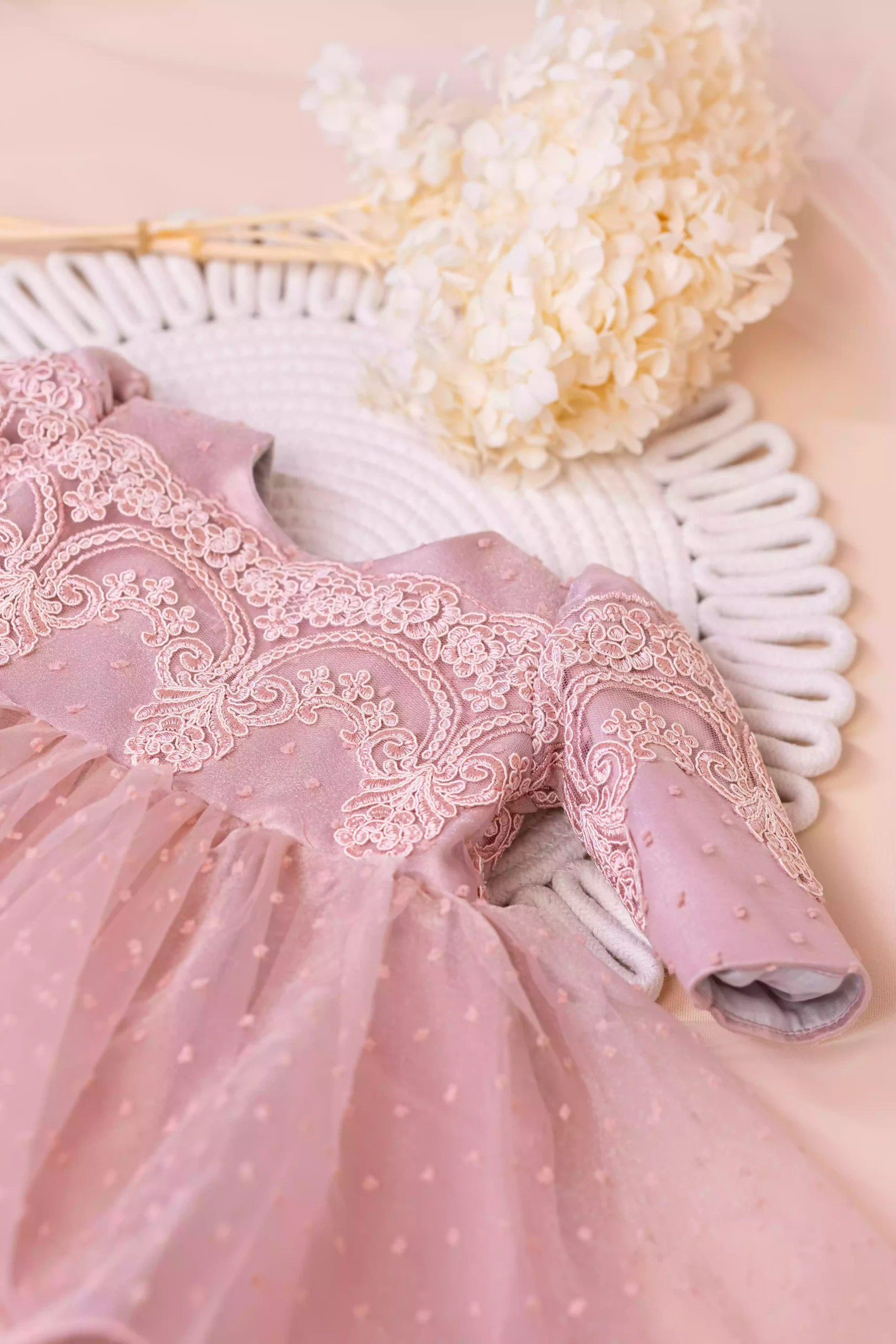 Rochița botez Alicia, cu dantelă fină și tul, perle delicate și fundă în talie, căptușită cu bumbac pentru confort și eleganță absolută.