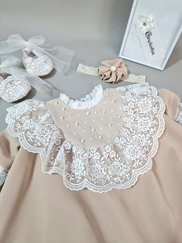 Rochița de botez Ivanna îmbină rafinamentul designului modern cu farmecul motivelor tradiționale, oferind confort deplin datorită interiorului din bumbac 100%. Setul complet include rochiță, botoșei asortați și bentiță delicată, perfecte pentru un botez memorabil.