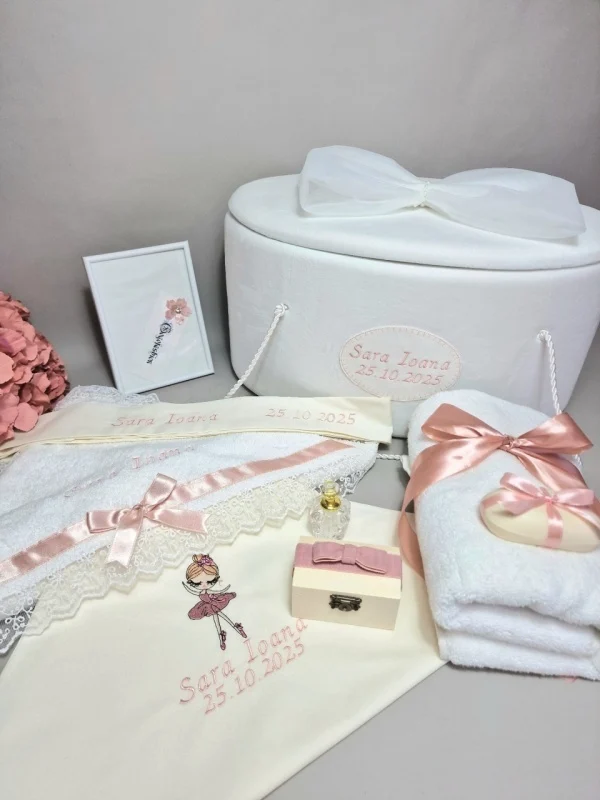 Pe lângă funcționalitate, trusoul este gândit și pentru estetică. Materialele alese sunt delicate și sigure pentru pielea bebelușului, iar designul sofisticat al cufărului și al accesoriilor creează un ansamblu vizual armonios. Fiecare detaliu este realizat cu atenție, pentru ca ceremonia botezului să fie un moment de neuitat atât pentru părinți, cât și pentru invitați.